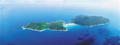 拨云见日,日光下彻,水深湾阔。航拍定格下大洲岛渐变蓝的双色海水,碧蓝的大海慢慢铺开,由湛蓝到浅蓝,越来越透明。