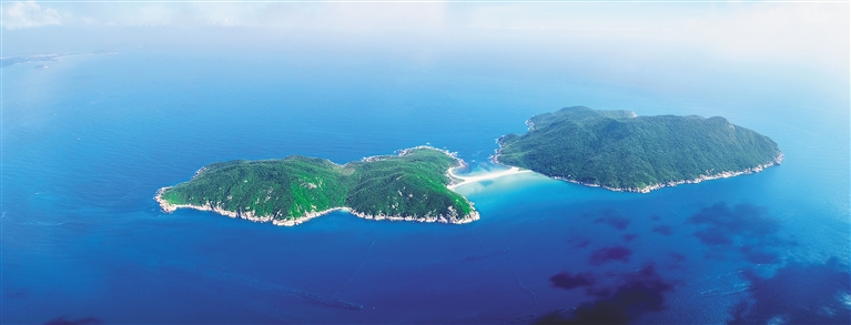 大洲岛分南大岭和北小岭两部分,面积大约4.2平方公里,最高峰海拔289米。两岭三峰对峙相望,一道银白沙滩横贯其间,像一张满弓又似一轮弯月。退潮时,洁白的沙滩便露出水面,与澄碧的海水、翱翔的金丝燕一起构成“渚清沙白鸟飞回”的自然美景。