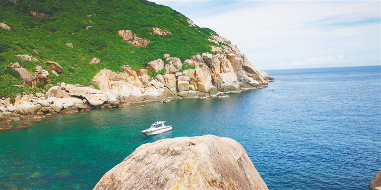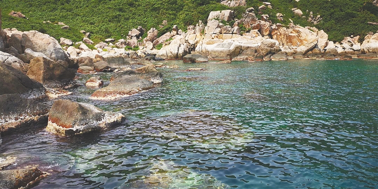 大洲岛海洋面积65.8平方公里,石奇海美,周边海域海水清澈,一般水下可见5米至10米远,海底生物多姿多彩。晨光熹微,山海之间的倒影颇似“峙峰倒影山浮水,无水无山不入神”的幻景,山间微风鼓浪时,更是如碧水泄玉,银练抛空。