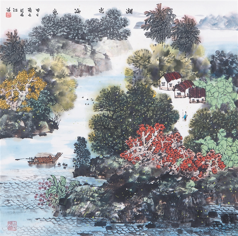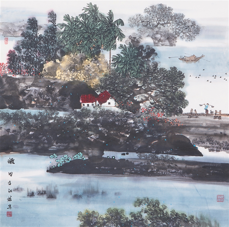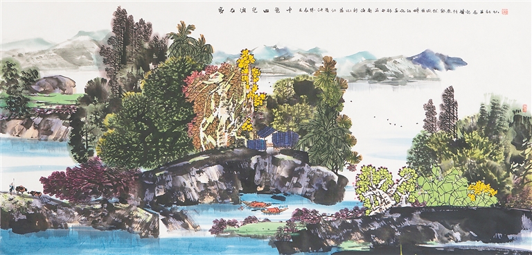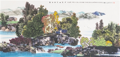 他这个时期的作品,在树木和山石的刻画技法上,依然坚守传统的衣钵,皴法用得很丰富,大体是以“斧劈皴”为主,表现南方山石的浑厚圆润。染色法都是层层跳染,但仍然以墨为主,间以亮色,效果是靓丽、飘逸、透明、清澈,最能贴切展现海南岛的地域特色。
