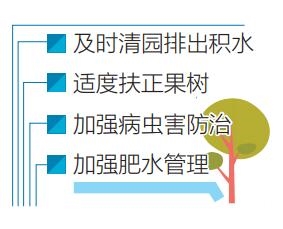 风雨过后,胡福初建议果农要抓紧时间挖通水沟,排去果园积水,防止果树根系长时间浸水受害;要及时疏除损坏严重的枝梢;及时适度扶正被风吹倒刮歪的树体,培土压实,有条件的加支架保护;要及时喷杀菌剂,防止真菌病害的发生流行,建议药剂为嘧菌酯、苯醚甲环唑、甲基托布津、多菌灵、代森锰锌和灭病威等;要适当通过叶面补充核苷酸、三十烷醇等有机营养和中微量元素,促进树体营养的积累。