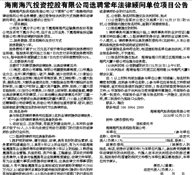 海南海汽投资控股有限公司选聘常年法律顾问单位项目公告