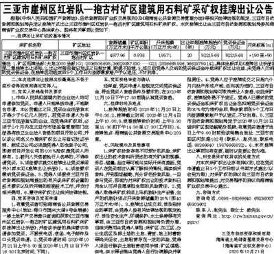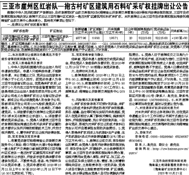 三亚市崖州区红岩队—抱古村矿区建筑用石料矿采矿权挂牌出让公告