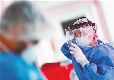 阿根廷卫生部19日发布的新冠疫情数据显示,该国累计确诊病例已突破100万例。阿根廷成为继美国、印度、巴西和俄罗斯之后,第五个累计病例数达“百万级”的国家。图为在阿根廷布宜诺斯艾利斯一家医院,医护人员佩戴防护面罩。 新华社/路透