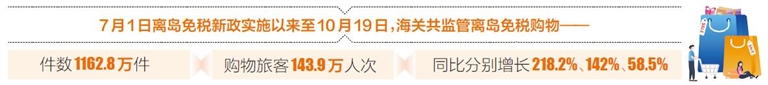 2020年7月1日离岛免税新政实施以来至10月19日,海关共监管离岛免税购物金额达108.5亿元、件数1162.8万件,购物旅客143.9万人次,同比分别增长218.2%、142%、58.5%。