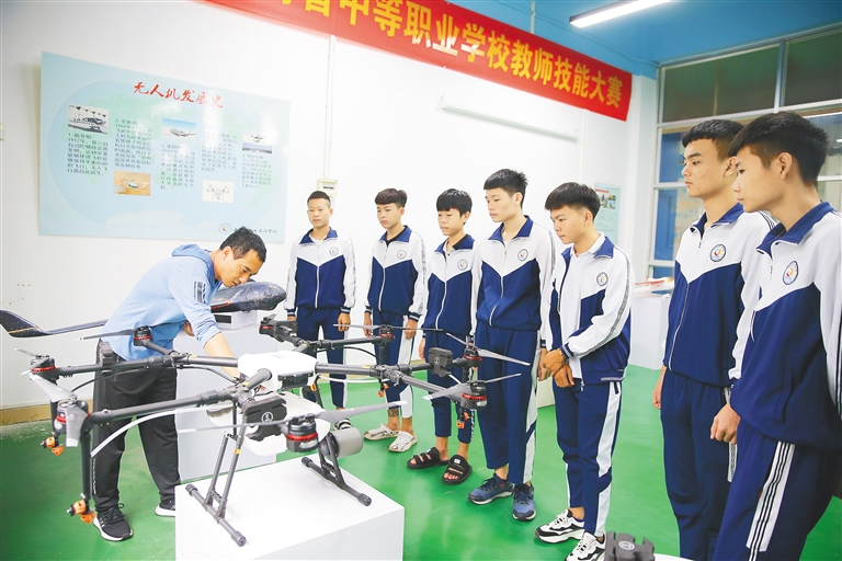 近日,海南省机电工程学校内,该校教师张渤海(左)在给学生教授无人机技术应用课程。