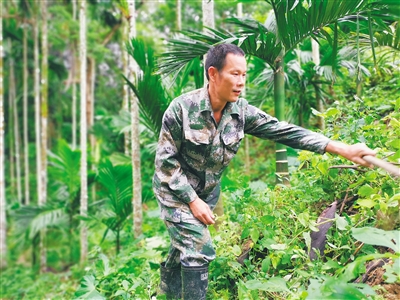 最开始,王升发的“基地”里只有几亩长势不好的槟榔树、橡胶树,每年割胶、卖槟榔青果的收入,连一家3口人的温饱都难以解决,女儿的学费更是让他头疼不已。2014年6月,王升发一家被列为建档立卡贫困户,政府帮忙解决了孩子的教育开支问题后,他慢慢感觉日子有了奔头。王升发先是去三亚一个工地务工,依靠打工的收入,于当年就摘了“贫帽”。