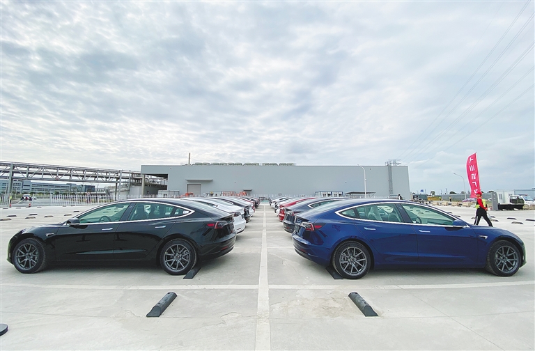 10月26日拍摄的特斯拉上海超级工厂内的Model 3汽车。