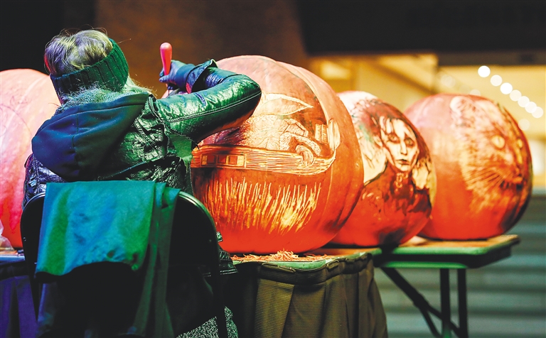 10月24日,一名雕刻师在美国伊利诺伊州格伦科的芝加哥植物园雕刻南瓜灯。芝加哥植物园在万圣节前举办南瓜灯展,展出1000多个手工雕刻的南瓜灯。 新华社发(乔尔·莱纳摄)