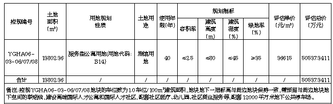 一、挂牌出让宗地基本情况和开发建设要求(一)挂牌出让宗地基本情况。本次挂牌出让宗地位于凤凰海岸片区控规YGHA06-03-06/07/08地块, CGCS2000坐标系面积13802.36平方米(海南平面坐标系面积13793.88平方米),用地四至及界址坐标详见地块勘测定界图。该宗地规划用地性质为服务型公寓用地(用地代码:B14),对应土地用途为旅馆用地。该宗地系拆迁完成的国有存量建设用地。2020年8月21日,三亚市人民政府出具了《关于凤凰海岸片区控规YGHA06-03-06/07/08地块内约13800平方米用地具备净地出让条件的证明》,证明凤凰海岸片区控规YGHA06-03-06/07/08地块内约13800平方米用地土地征收及“两公告一登记”工作已完成。三亚市天涯区人民政府已与被征地单位签订了《征用土地补偿协议书》,土地补偿款、安置补助费、青苗补偿费和地上附着物等款项已支付到位,相关征地材料现存于天涯区人民政府。目前地块上的附着物已清表、无法律经济纠纷、土地开发利用规划条件明确、符合土壤环境质量要求。地块周边可以满足施工建设所需的水、电供应,相关设备、机械可以进场施工。该宗地具备净地出让的条件。经我局核查,该宗地不属于非法占地、违法建设行为已经处置到位并组织供应的土地。该宗地概况及规划指标等情况详见下表: