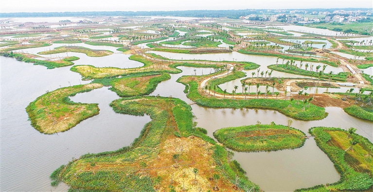 近日,俯瞰完成园林绿化种植的海口江东新区迈雅河区域生态修复项目示范区,一片绿意盎然。