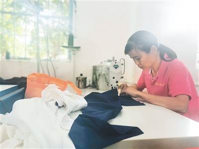 在新民村,原本闲置的校舍里建起了打板、烫台、设计等工作室,扶贫车间生产的制服销往海南三亚、广东等地的酒店。