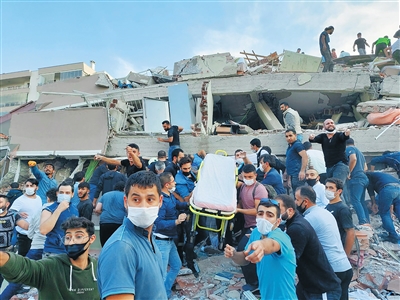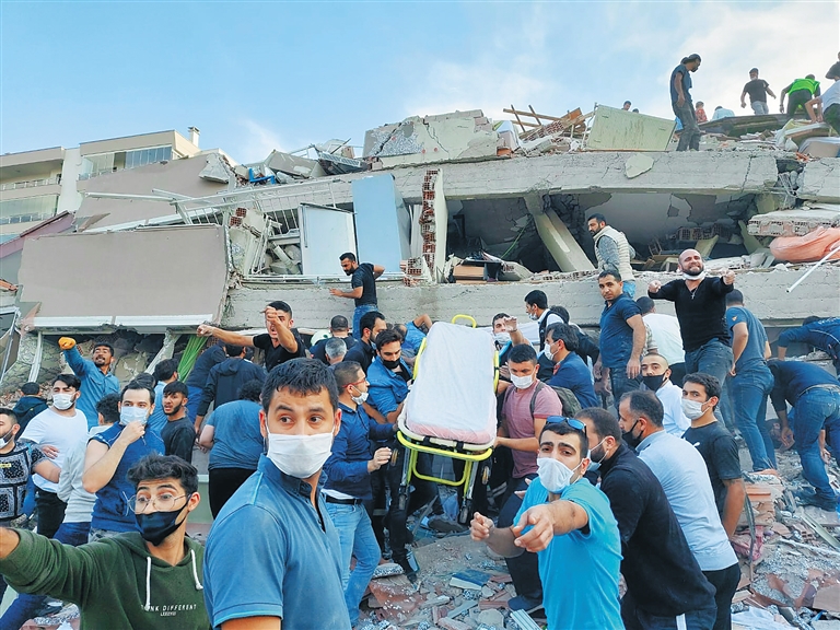 10月30日,在临近希腊萨摩斯岛的土耳其伊兹密尔,人们参与震后搜救工作。