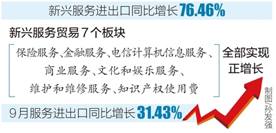 9月,全省服务进出口额24.93亿元,同比增长31.43%,较8月环比增长137.65%。其中,进口20.09亿元,同比增长101.89%。商业服务、计算机服务、与影音产品相关的知识产权使用费高速增长,成为服务贸易主要支撑点。其中知识产权交易活跃,单月进出口12.13亿元。