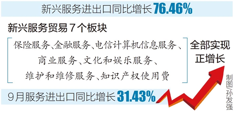 本报海口10月31日讯(记者罗霞 通讯员李鹏)海南日报记者10月31日从省商务厅获悉,今年前三季度,我省服务进出口总额128.33亿元,其中新兴服务进出口额同比增长76.46%,占服务进出口总额的比重超过50%。9月,全省服务进出口额同比实现明显增长。