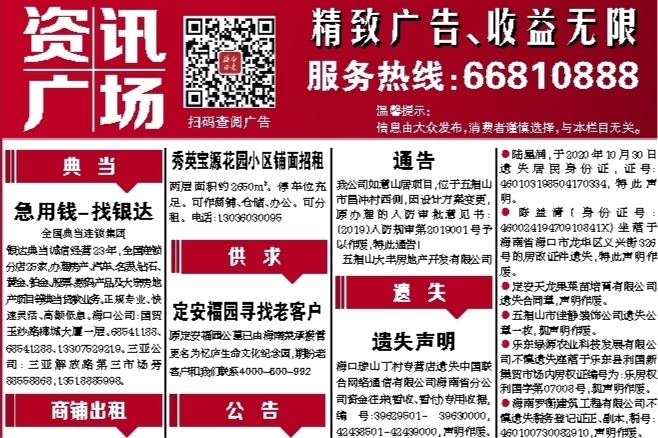 ●陆星润,于2020年10月30日遗失居民身份证,证号:460103198504170334,特此声明。