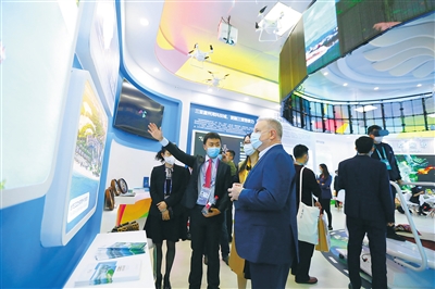 图① 三亚馆工作人员展示旅游产品。