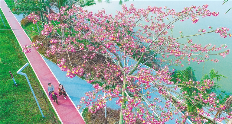 11月2日,在海口市红城湖公园,市民在美丽异木棉花下漫步,不时驻足留影。时下海口多地美丽异木棉花开正艳,成了秋日里一抹独特风景。本报记者 张茂 摄