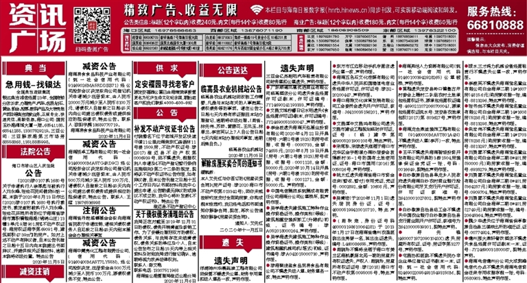 ●吴清培(于2020年11月1日)遗失居民身份证,证号:460005199410010710,特此声明。