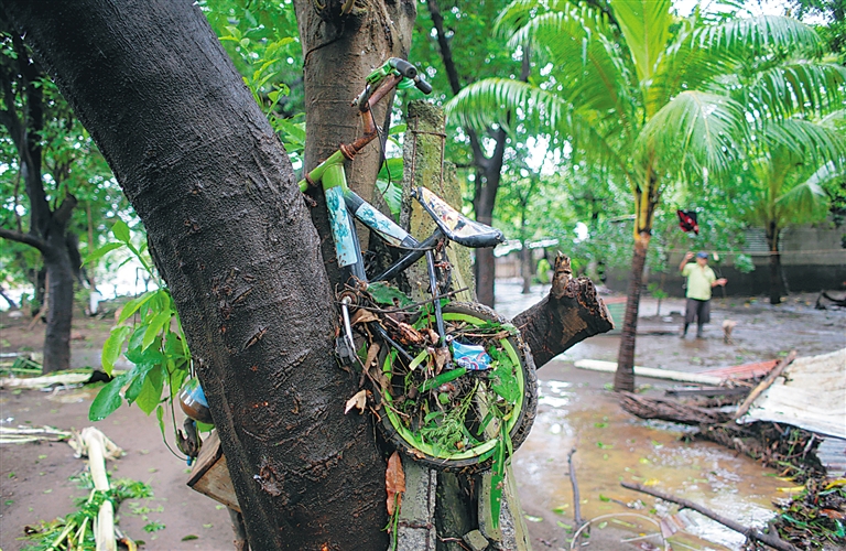 这是11月4日在尼加拉瓜马萨查帕拍摄的飓风“埃塔”过境后树上的自行车。