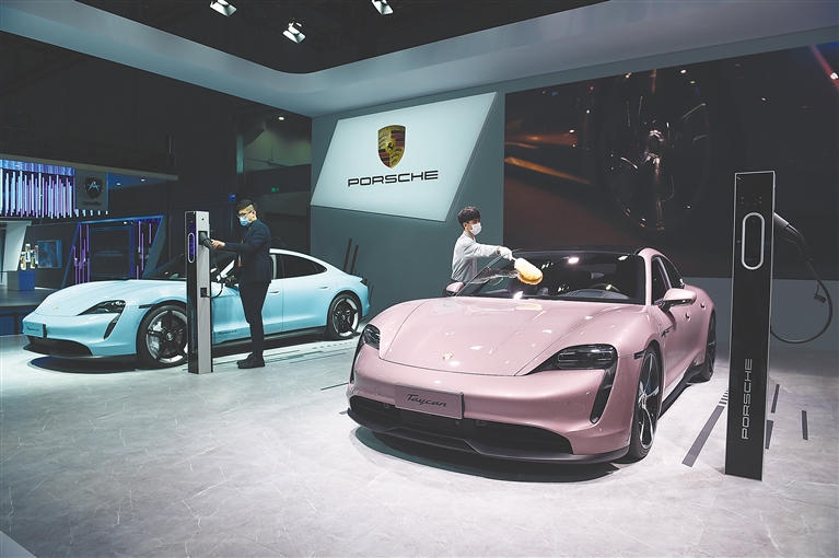 在大众汽车集团旗下的保时捷展台,一蓝一粉两辆颜色靓丽的电动跑车十分吸睛。预计到2025年,保时捷售出的每两台新车中,就有一辆由电力驱动。据悉,大众汽车集团在进博会上展示了8款纯电动车型,并宣布从2021年起在中国启动公益林项目,预计造林面积约4000万平方米,集团未来的发展目标是要在2050年之前实现碳中和,实现二氧化碳“零排放”。