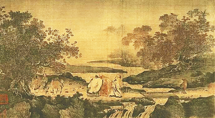 这副《虎溪三笑图》为南宋佚名作,现藏台北故宫博物院。该画不仅是宋人力图调和儒、释、道三教思想的反映,同时体现了宋人绘画成就的卓越。画中用笔细密、劲锐,设色古雅,主角们夸张的肢体语言、呼啸的急流、飘落的红叶、以及远处迷蒙的烟雾等,相融一气,整幅画充满了灵动之感。宋画的精妙,由此可见一斑。
