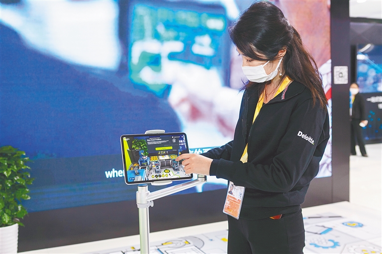在德勤展台,这里有最“聪明”的工厂——小黄鸭智能工厂。参观者借助VR(虚拟现实)技术,可直观了解到各智能场景是如何在工厂内得到实际应用。小黄鸭智能工厂通过实时洞察分析、全流程可视化与可扩展解决方案,帮助用户直击痛点,提供定制化的一站式服务,实现智能工厂转型。在普华永道展台,参观者可通过参与现场AR(增强现实)互动体验,成为数字产品“明日进博特刊”的封面人物。
