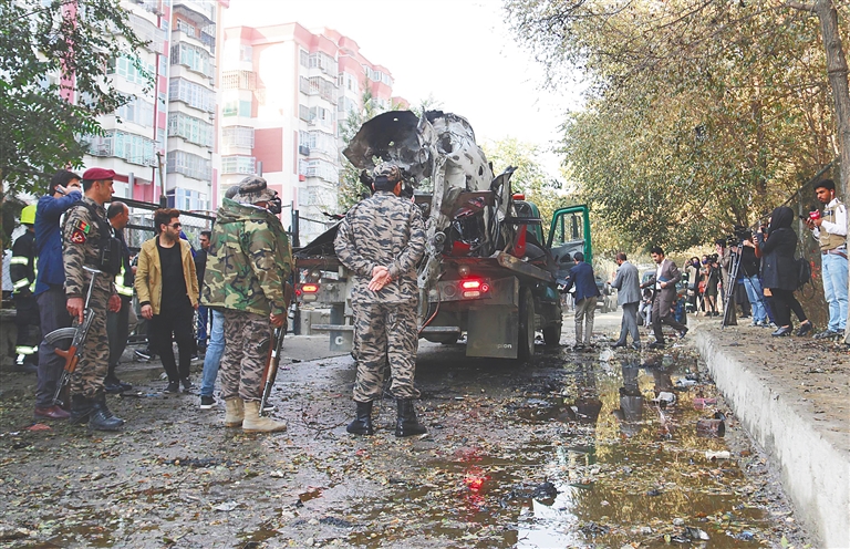 11月7日,在阿富汗喀布尔,安全人员检查爆炸袭击现场。