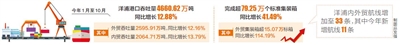 2019年8月15日,国家发改委发布《西部陆海新通道总体规划》,支持洋浦打造西部陆海新通道国际航运枢纽港;今年6月1日《海南自由贸易港建设总体方案》发布……在一系列利好政策的推动下,洋浦港口吞吐量连连攀升。今年1月至10月,洋浦港口吞吐量4660.62万吨,同比增长12.88%,其中外贸吞吐量2595.91万吨,同比增长12.16%;内贸吞吐量2064.71万吨,同比增长13.79%;完成超79.25万个标准集装箱,同比增长41.49%,其中外贸集装箱超15.07万标箱,同比增长114.19%。