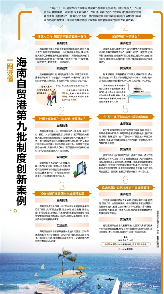 11月8日上午,我省发布了海南自贸港第九批制度创新案例,包括:外国人工作、居留许可联审联检一体化;社保关系转移“一次申请、全程代办”;“空地组网”推动低空空域管理改革;船舶登记“一事通办”;“五位一体”园区成片开发流程再造;临床急需进口药械多方协同追溯管理。这些案例集中体现了海南自由贸易港建设的阶段性发展成果。