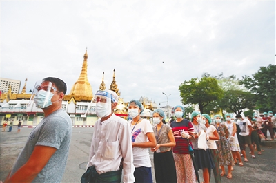 8日早晨5时许,天还没亮,缅甸仰光淡汶镇区一个投票站前,不少戴着口罩和面罩的选民开始有序地排队等待投票。