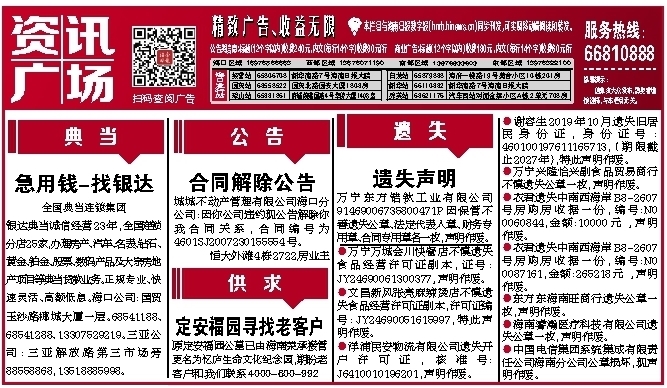 银达典当诚信经营23年,全国连锁分店25家,办理房产、汽车、名表、钻石、黄金、铂金、股票、数码产品及大宗房地产项目等典当贷款业务。正规专业、快速灵活、高额低息。海口公司:国贸玉沙路椰城大厦一层。68541188、68541288、13307529219。三亚公司:三亚解放路第三市场旁 88558868,13518885998。