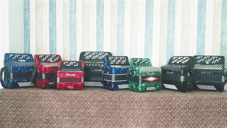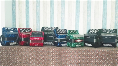 自那以后,手风琴就成了林川的最爱,他的微信头像就是自己半坐在一面墙前演奏手风琴的画面。“箫、小提琴等都是单旋律乐器,要佐以其他乐器伴奏,但手风琴是和声乐器,既能独奏又能伴奏,表现力很丰富,可以说,一台手风琴就是一个小型乐队。”林川说着说着,就从桌上取下一台手风琴,当即拉了起来,“手风琴是一种浪漫的乐器,演奏者把它抱在怀里,无论走到哪儿都可以带着,而且演奏姿势不限,可以随心所欲,不受空间限制,另外,它的声音洪亮,演奏者也不需要带音响。”