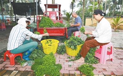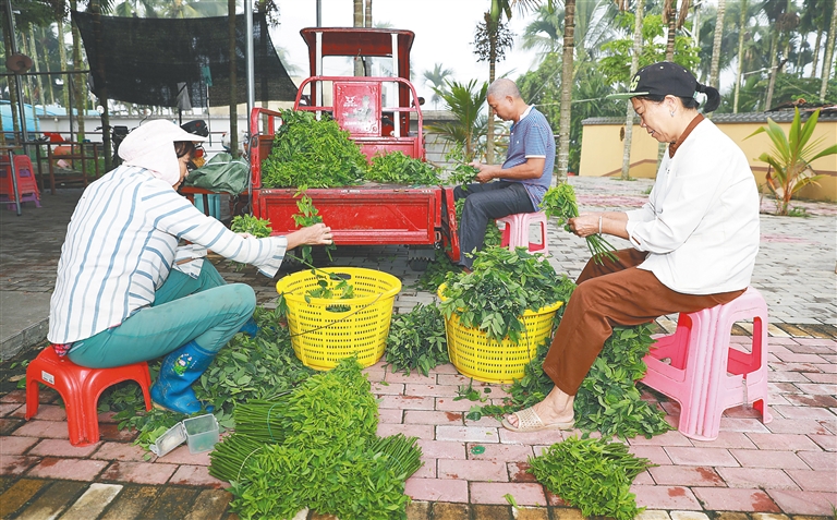 树仔菜是五指山的特色野菜,随着旅游旺季的临近,树仔菜有望在游客的带动下为村民增收。图为五指山市南圣镇同甲村村民捆扎采摘回来的树仔菜。