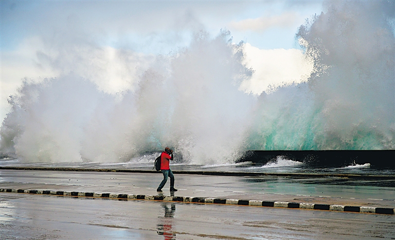 近日持续肆虐的飓风“埃塔”在墨西哥及中美洲地区国家引发灾害,截至11月9日已造成上百人死亡。图为一名男子在古巴哈瓦那海滨拍摄海浪。 新华社/法新