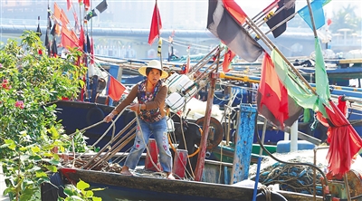 11月13日,回港避风的渔民正在海口市海甸溪加固渔船,准备上岸避风。 本报记者 张茂 摄