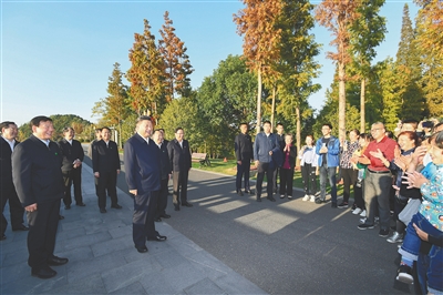 正在江边休闲散步的市民看到总书记来了,纷纷向总书记问好。习近平同大家亲切交流,对大家说,40多年前我来过五山地区,对这里壮阔江面的印象特别深刻。这次来,看到经过治理,曾经脏乱差的环境发生了沧桑巨变,成为人们流连忘返的滨江生态公园。大家生活在这样的城市里很幸福,幸福是你们共同奋斗、亲手创造出来的。习近平指出,城市是现代化的重要载体,也是人口最密集、污染排放最集中的地方。建设人与自然和谐共生的现代化,必须把保护城市生态环境摆在更加突出的位置,科学合理规划城市的生产空间、生活空间、生态空间,处理好城市生产生活和生态环境保护的关系,既提高经济发展质量,又提高人民生活品质。当前,境外疫情仍在蔓延,我国外防输入、内防反弹压力还很大。希望大家始终不放松疫情防控这根弦,继续落实各项常态化疫情防控措施,坚决防止疫情出现反复。