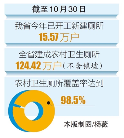 本报海口11月14日讯(记者孙慧 通讯员杨洲 实习生焦晴)海南日报记者11月14日从省住房和城乡建设厅获悉,截至10月30日,我省今年已开工新建厕所15.57万户,全省建成农村卫生厕所124.42万户(不含镇墟),农村卫生厕所覆盖率达到98.5%,基本实现了农村人居环境三年整治目标。