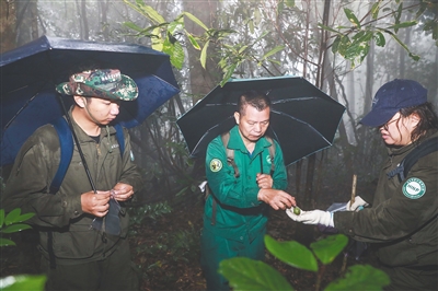 在霸王岭这片区域,生物多样性保持得相对较好。陈玉凯介绍,从东崩岭一路走过来,植物的分布具有一定的规律,比如,在山顶发现亚洲热带雨林的典型代表——低地雨林群落的青皮林的分布,再到以岭南山竹、高山榕、鸭脚木为代表的沟谷雨林群落的分布,最后是山腰及以下的次生枫香林或黄牛木林的分布,雨林植被层次特征明显。