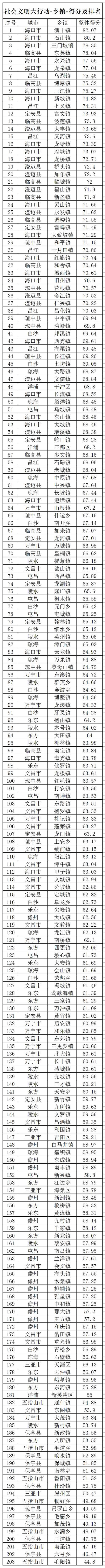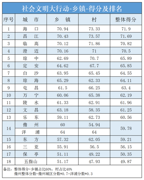 整体得分排名分列前5位的市县依次是海口、昌江、临高、澄迈、琼中,得分分别为71.90分、71.65分、70.82分、70.50分、65.89分;整体得分排名分列后3位的市县依次是三亚、保亭、五指山,得分分别为56.15分、50.35分、49.87分。
