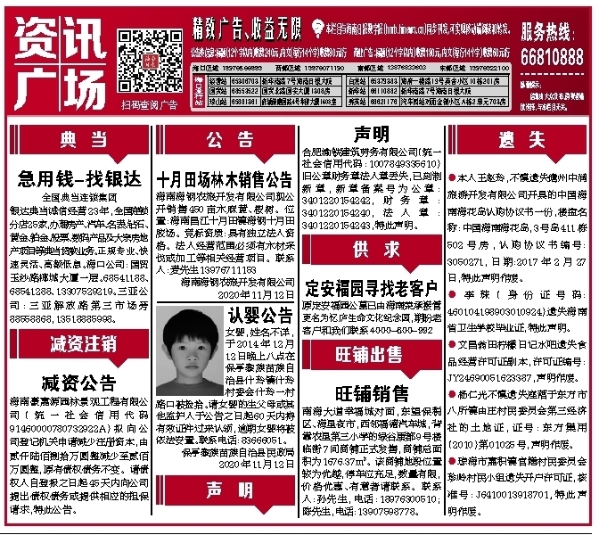 女婴,姓名不详,于2014年12月12日晚上八点在保亭黎族苗族自治县什玲镇什玲村委会什玲一村路口被捡拾。请女婴的生父母或其他监护人于公告之日起60天内持有效证件过来认领,逾期女婴将被依法安置。联系电话:83666051。