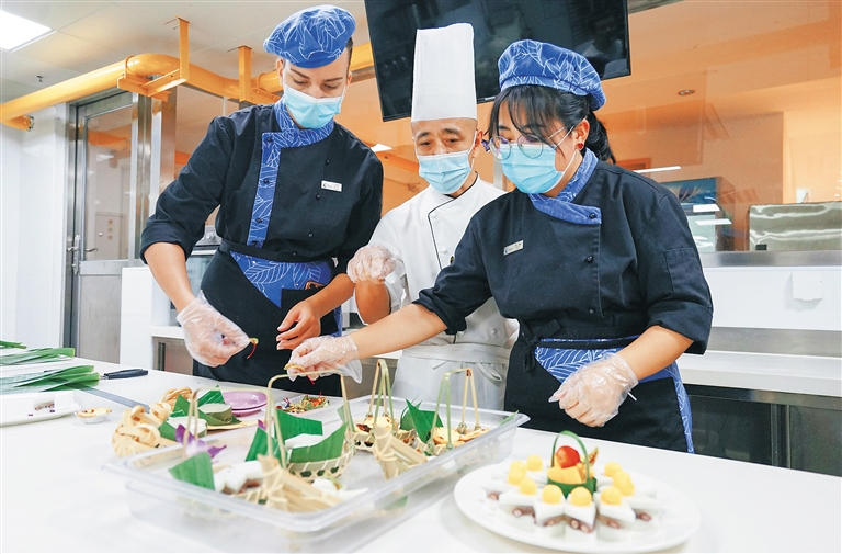 11月12日,在三亚中瑞酒店管理职业学院,学生们在老师的指导下向参观者展示所学技能。