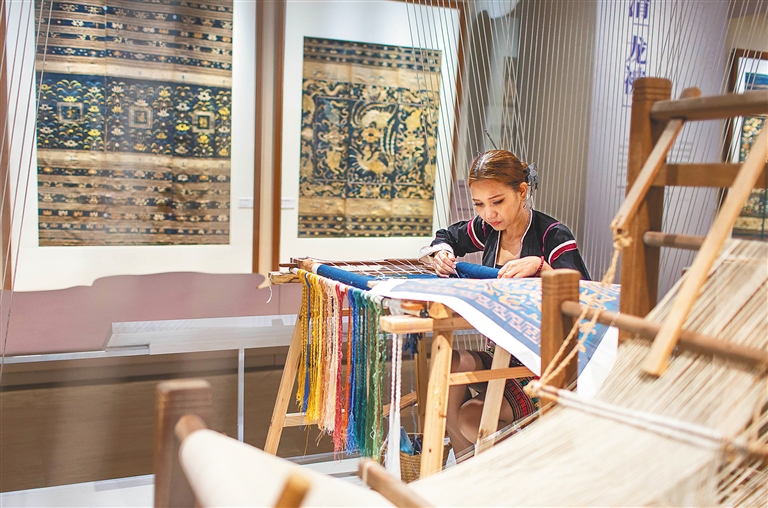 “百卉千华 锦上添花——海南龙被艺术大展”中,双面绣省级代表性传承人符秀英身穿黑色贯首衣,正在织就龙被中的一幅。旁边,是她用苏木、谷木树叶、姜黄、野板栗树皮等植物染色而成的各色纱线。