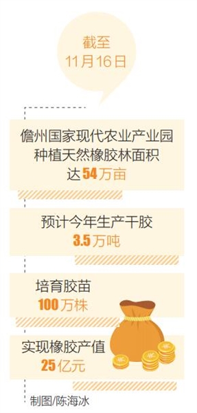本报那大11月16日电 (记者林书喜 特约记者李珂 通讯员韦雪梅)儋州市加快国家现代农业产业园建设,大力发展天然橡胶主导产业。截至11月16日,儋州国家现代农业产业园种植天然橡胶林面积达54万亩,预计今年生产干胶3.5万吨,培育胶苗100万株,实现橡胶产值25亿元,带动园区内农村居民人均可支配收入达1.77万元。