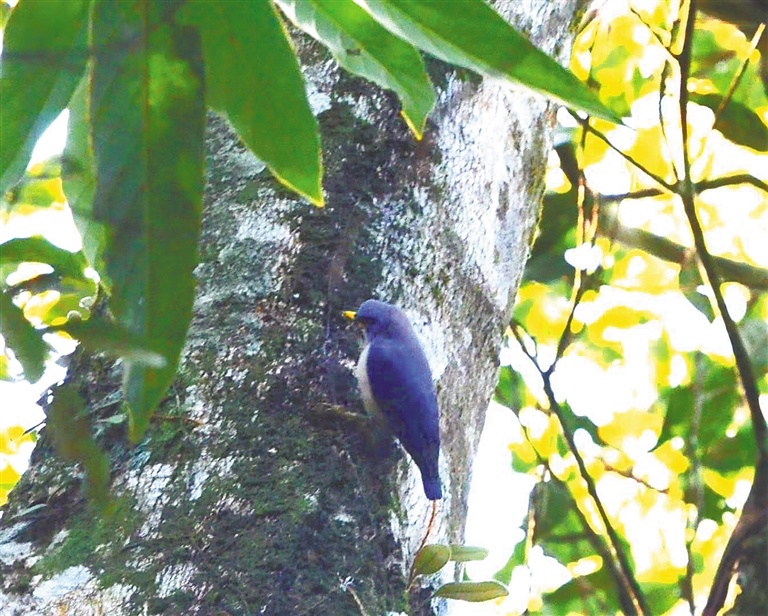 淡紫䴓在我国仅分布在海南地区,据发现此鸟的监测队员魏亚情介绍,当天早上在监测完长臂猿之后,一只小鸟进入他的视野,中等体型、色彩艳丽,鸟喙黄色,他迅速按下了相机快门。