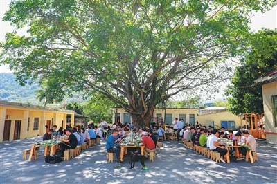 山兰米煮熟后,饭香扑鼻,着实令人难忘,“一家煮山兰全村香”至今广为流传。邀约远方亲朋来吃新米,庆丰收,不仅能让山兰的滋味氤氲于口,这也是白沙黎族群众对来年风调雨顺、积谷千仓的一种美好期盼。在当天活动的丰收长桌宴环节,活动承办方将在拥处村千年古榕树下布置“感恩长桌宴”,到时,长长的方桌铺着绿油油的芭蕉叶,上面盛放白沙各种各样原汁原味的山兰酒和特色美食——竹筒饭、鱼茶、肉茶、五脚猪肉等;可以期待的是,到时在席间觥筹交错,将处处散发出淳朴又欢快的庆丰收节庆氛围。