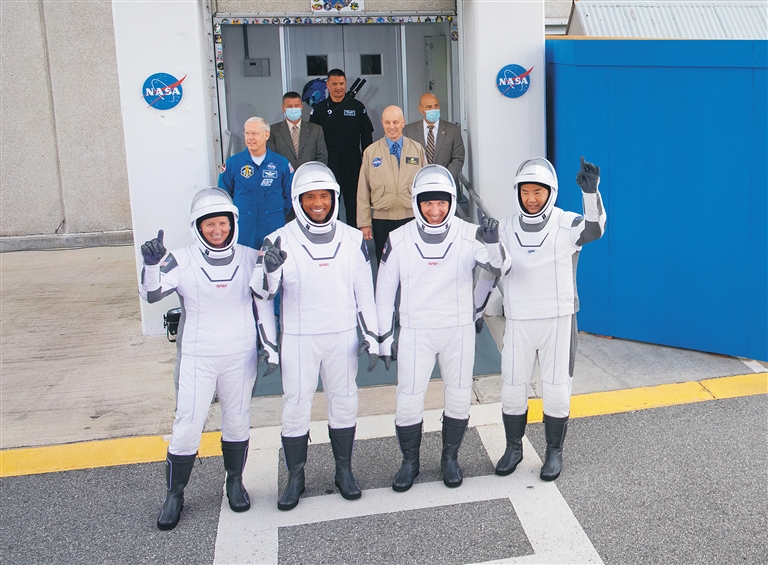 这是11月15日在美国佛罗里达州肯尼迪航天中心拍摄的参与这次代号“Crew-1”航天任务的宇航员香农·沃克,维克托·格洛韦尔,迈克尔·霍普金斯,和日本宇宙航空研究开发机构的宇航员野口聪一(从左至右)。