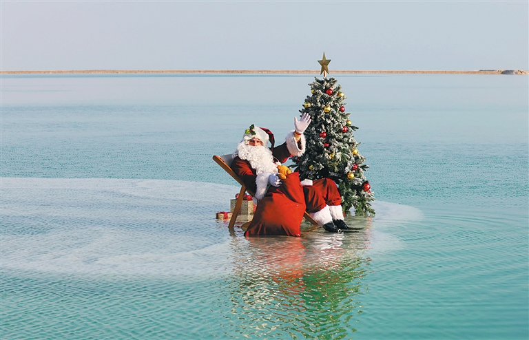 11月15日,一名打扮成圣诞老人的男子在死海中招手。当日,一名打扮成圣诞老人的男子来到死海游泳。在圣诞季前夕,以色列旅游部组织了包括上述场景在内的多项活动,希望为遭受新冠疫情冲击的当地旅游业营造节日气氛。新华社/法新