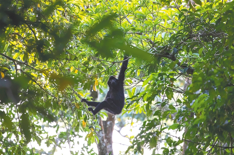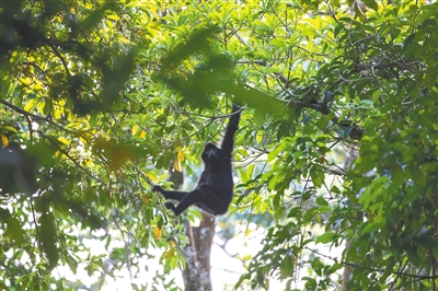 “刚想举起相机,它就跑没影了。”抬头看见海南长臂猿的一团团“黑影”或“黄影”从头顶的枝桠间快速掠过,不少调查队员都被它们的一身好“轻功”所折服,也有人为小家伙们的安全操碎了心——它们真的不会从树上掉下来吗?