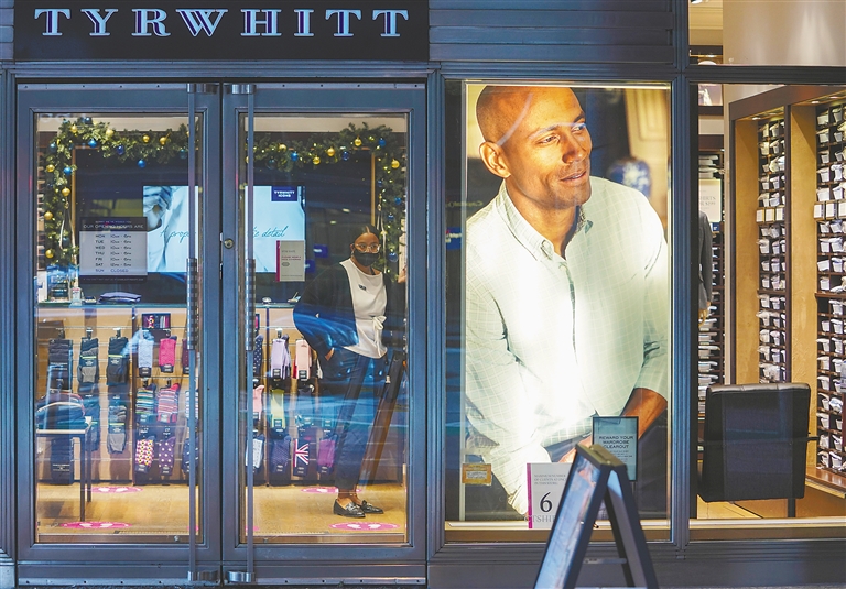 11月18日,在美国纽约,店员在空荡荡的商店内等待顾客。